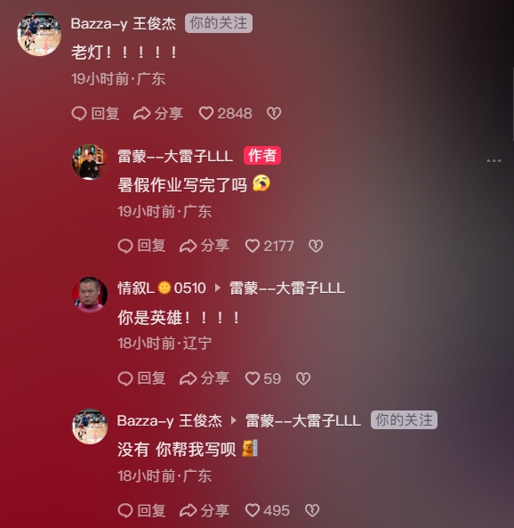 王俊杰现身雷蒙社媒评论区:老灯!!雷蒙:暑假作业写完了吗?