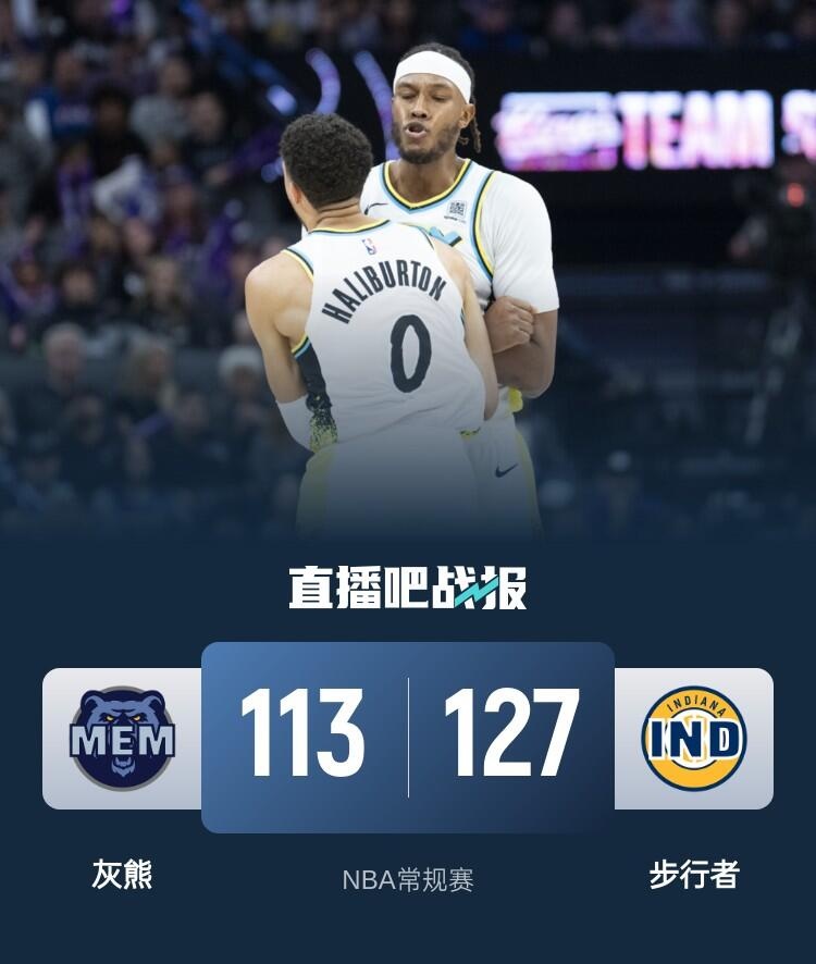 上半场,灰熊率先发力,多点开花很快占据场上主动,步行者连中三分追赶,次节步行者万箭齐发,特纳内外开花独得15分,哈利伯顿得分助攻一肩挑,步行者单节50-26净胜灰熊24分,半场战罢步行者78-59领先灰熊。下半场,步行者占得先机将分差拉开到26分,但灰熊攻防两端发力一度追到只差4分,末节步行者稳扎稳打再度将分差拉开到15分以上,灰熊大势已去无力回天。最终,步行者127-113击败灰熊,主场过关。