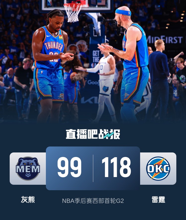 比赛开始,雷霆内外开花打出15-4的开局确立优势,灰熊冲击篮筐连投带罚努力追赶,雷霆连续三分命中扩大优势,次节莫兰特挺身而出连得7分缩小分差,双方大打对攻,雷霆外线开花轰进6记三分一度将分差拉开到20分以上,灰熊一波9-2艰难止血,半场战罢雷霆70-52领先灰熊。易边再战,雷霆命中率骤降,灰熊内外开花一度将分差缩小到个位数,末节雷霆再度轰出11-2的攻击波重获20分优势,灰熊苦苦追赶无果。最终,雷霆118-99轻取灰熊,总比分2-0取得领先。