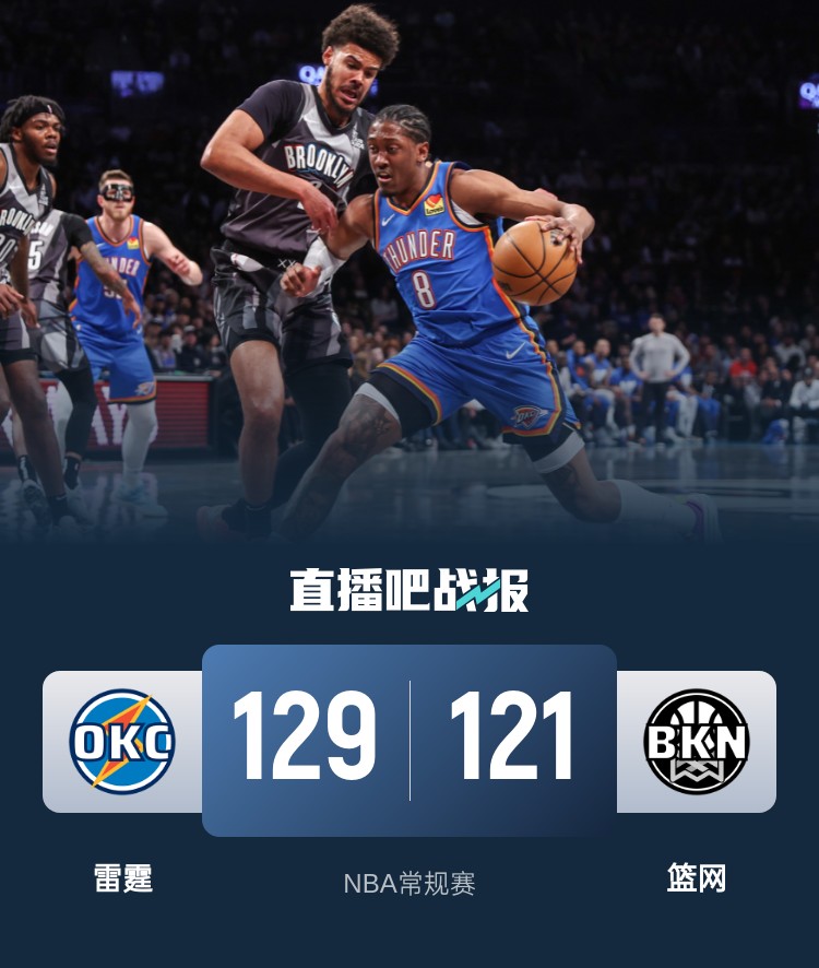 雷霆作为联盟防守效率最好的球队却在第一节打出最糟糕的防守,他们面对篮网单节狂丢40分导致落入被动;篮网方面以三记三分开局轰出20-8的攻势抢占先机;亚历山大和维金斯末段联手拿下17分帮助雷霆止血追分,但防守端无法阻止对手;次节篮网再度轰下36分,篮网面对西部领头羊半场砍下76分并取得15分领先。休息归来雷霆在拉锯大半节后逐渐找回领头羊的实力,他们第三节末至第四节初轰出26-7的攻势直接抹掉劣势并实现反超。这之后雷霆彻底接管比赛不断拉大领先锁定胜局。最终,雷霆客场逆转篮网拿下比赛。