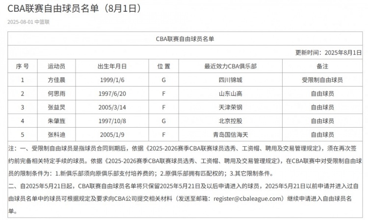 8月2日讯 昨天,CBA官方更新了自由球员名单。