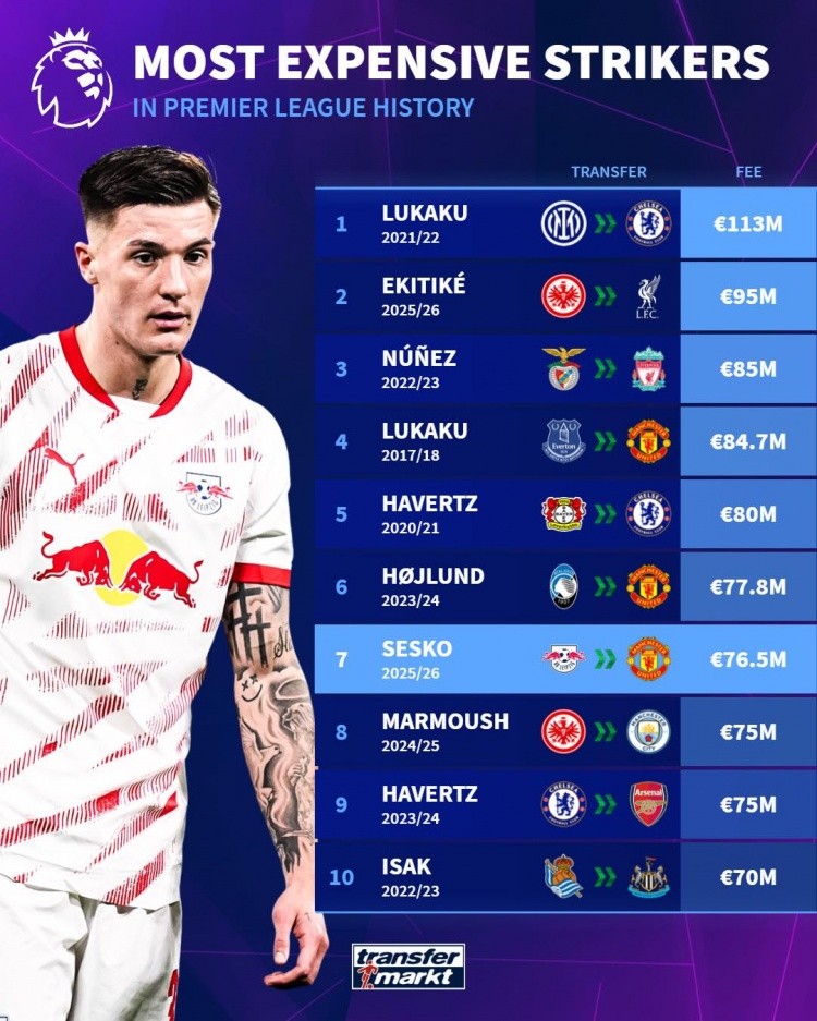 英超历史最贵前锋排行:卢卡库&哈弗茨梅开二度,前十曼联占三次
