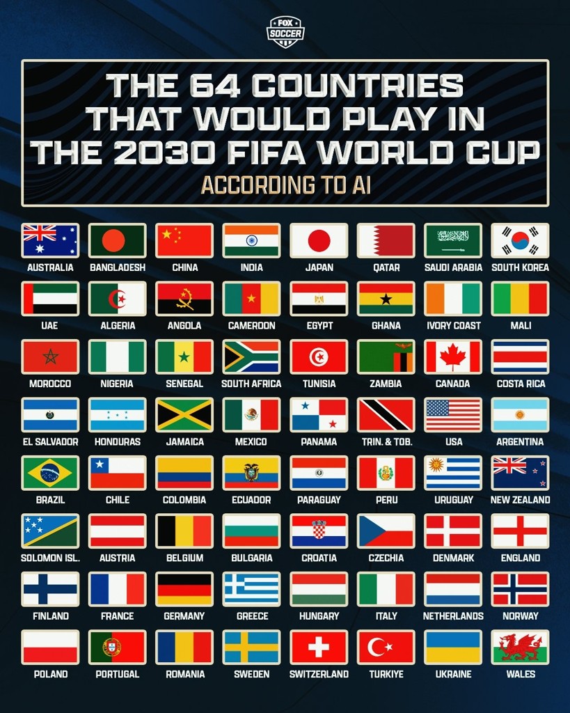 福克斯足球发文,表示要求ChatGPT列出如果2030世界杯扩军64支队后所有的64个国家。同时福克斯写道:你觉得这种形式是个好主意吗?