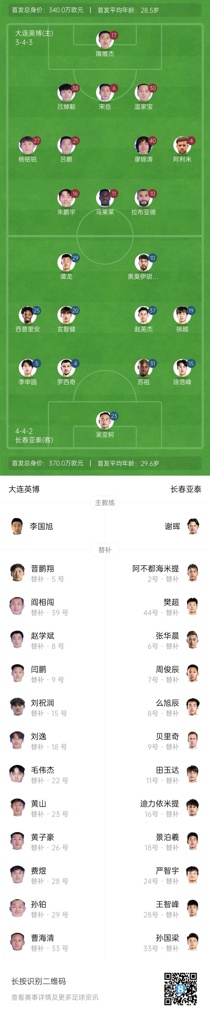3月29日讯 中超联赛第3轮,大连英博vs长春亚泰的比赛将于今天下午15:30进行,两队首发均已公布。值得一提的是,大连英博方面17岁小将杨铭锐首发出战,上演自己的中超首秀。