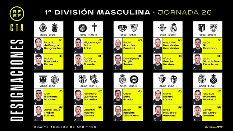 西甲第26轮裁判:埃尔南德斯执法皇马,昆特罗-冈萨雷斯主裁巴萨