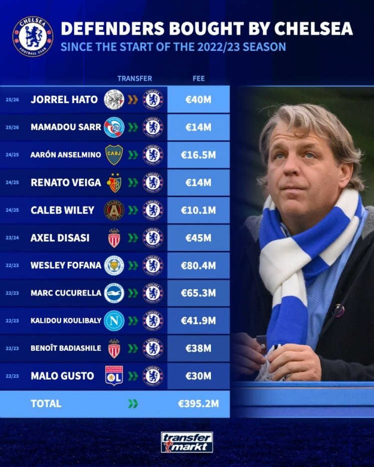 德转列切尔西近3年后卫引援:总转会费3.952亿欧元