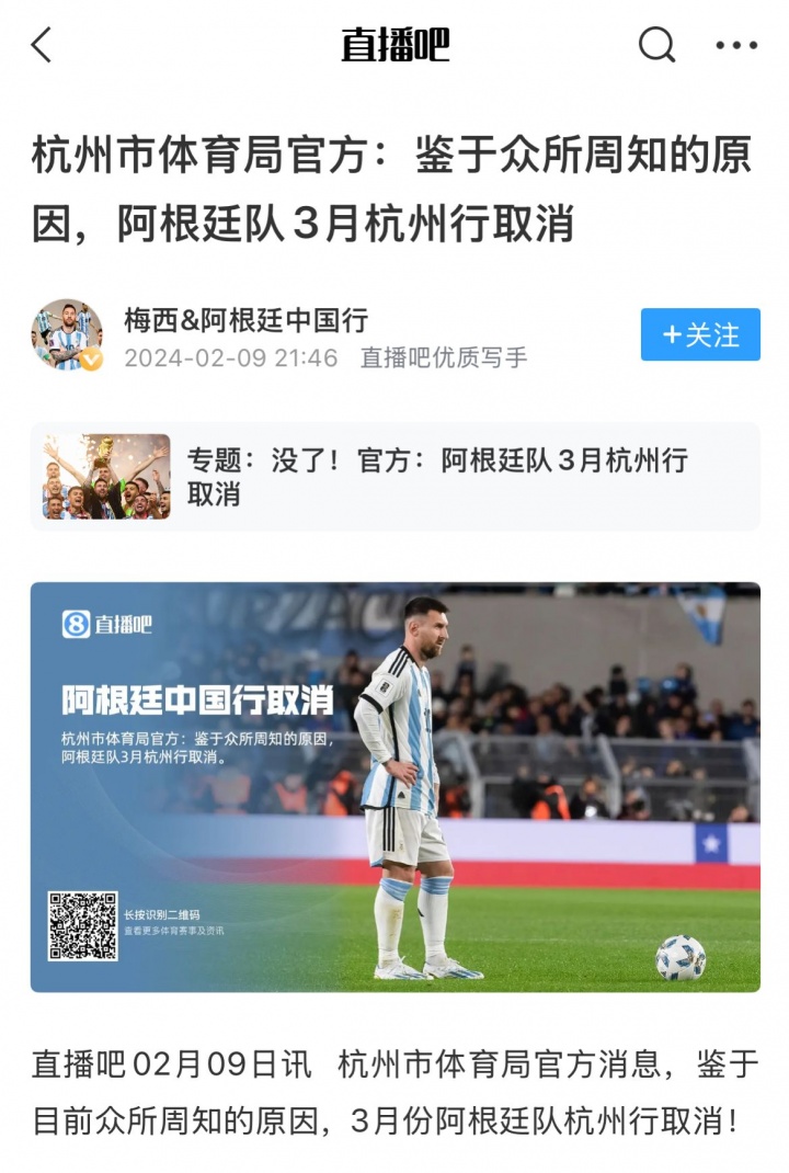 梅西在那次中国香港行中缺战迈阿密国际vs香港明星队的比赛,事件冲击波持续扩散:中国杭州随即宣布取消原定的阿根廷与尼日利亚队的热身赛——这场比赛原本计划是阿根廷备战2024美洲杯的开端,而阿根廷最终夺得了那一年的美洲杯冠军。